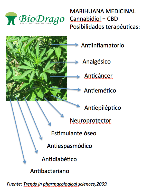 La selección de cepas de marihuana (Cannabis sativa) con bajos niveles de Tetrahidrocannabinol (THC) inferiores al 0,2%, el componente responsable de los efectos psicotrópicos o “recreativos”; y niveles elevados de Cannabidiol (CBD), permite desde ya legalmente en España y otros países de la Unión Europea, el consumo libre como suplemento dietético de extractos de aceites ricos en CBD libres de la connotación legal como estupefacientes y sin embargo, según estudios preclínicos y clínicos de investigaciones actuales no se han reportado efectos adversos, toxicidad o actividad psicotrópica, lo cual focaliza la atención en un abanico de dianas terapéuticas tremendamente esperanzador para contrarrestar los fenómenos inflamatorios o el dolor, y mejorar la evolución de enfermedades diversas como el cáncer, la epilepsia, artritis reumatoide, etc.